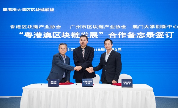 2018年11月9日,粵港澳大灣區區塊鏈聯盟成立大會在廣州市黃埔區、廣州開發區舉行。聯盟的首批成員單位共54家,來自粵港澳三地,涵蓋技術、基金、孵化、培訓等眾多區塊鏈專業領域。