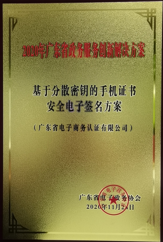 廣東省電子商務認證有限公司榮獲2020年廣東省政務服務創新解決方案牌匾
