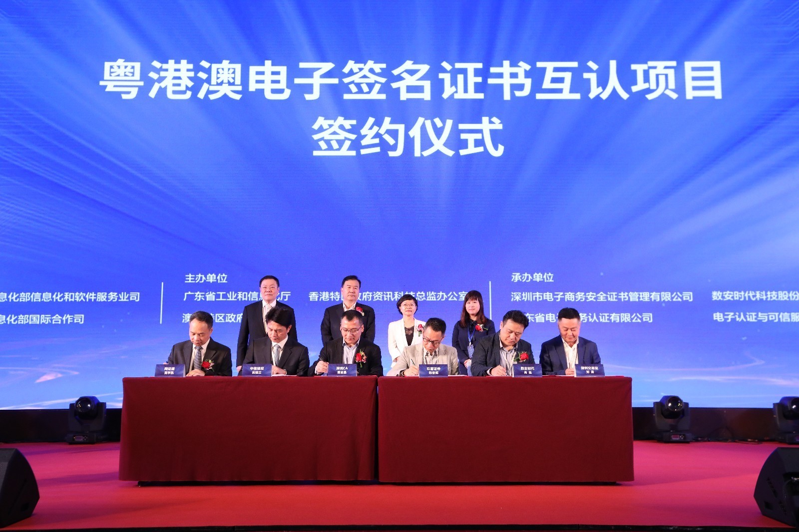 2019年11月15日,粵港澳大灣區電子簽名證書互認工作組成立大會暨電子認證發展論壇在深圳成功舉辦。大會認真貫徹落實習近平總書記重要批示精神和《粵港澳大灣區發展規劃綱要》要求,以“智聯互認,無界灣區”為主題,探討電子簽名在金融、公共服務及商貿等領域發展應用。本次大會在工信部信息化和軟件服務業司和工信部國際合作司指導下,由廣東省工業和信息化廳、香港特區政府資訊科技總監辦公室和澳門特區政府郵電局主辦、廣東省電子商務認證有限公司(簡稱:“網證通NETCA”)等機構具體承辦。