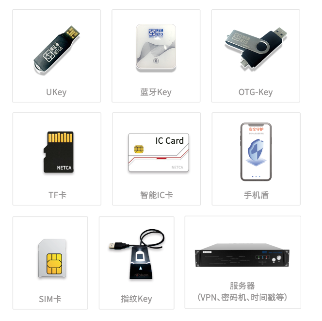 網(wǎng)證通CA的證書(shū)介質(zhì)形態(tài)多樣如下圖1所示,可以滿(mǎn)足不同場(chǎng)景的應(yīng)用。具體如下: